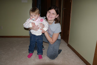 Audrey is growing up sooo much lately. She has been trying to put her own shirts on, she is obsessed with fleece sweatshirts. We have to hide them away at night or she would want to wear them all to bed. We have been working on her eating skills with a regular cup and silverware. She is able to pick things up with a fork now, but she then grabs the food off the fork with her hands and eats it. Atleast she is getting the process down. She can drink out of a regular little cup, but only with a very small amount in the cup.
